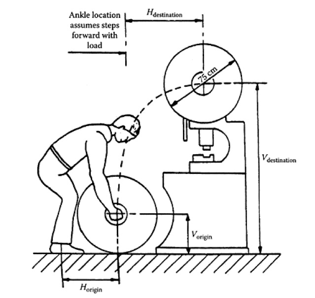 จากรูป จะเป็นตัวอย่างกิจกรรมในการเปลี่ยนตัว heavy reel จากเครื่อง punch press ซึ่งกิจกรรมนี้จำเป็นต้องทำในทุกๆกะเวลา โดยต้องยกขึ้นสูงกว่าศรีษะเพื่อดันเข้าไปในส่วนบนของเครื่องจักร ซึ่งนำหนักของ heavy reel อาจจะเกินกว่าที่กฎหมายแรงงานคุ้มครองและควบคุม ขนาดน้ำหนักในงานที่ลูกจ้างต้อง ยก แบก หาม หาบ ทูน ลาก หรือเข็น วัตถุนั้นตาม เพศ อายุ ของลูกจ้าง พระราชบัญญัติคุ้มครองแรงงาน พ.ศ.2541 กำหนด หรืออาจจะเกินจากที่แนะนำจากแนวทางปฏิบัติของ NIOSH