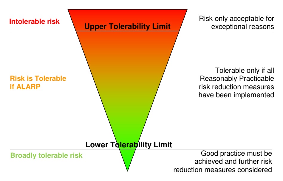 จากรูปด้านล่าง แสดงให้เป็นว่าความเสี่ยงทั้งหมดจะถูกแบ่งง่ายๆออกเป็น 3 ช่วง โดยช่วงแรกคือ ช่วงความเสี่ยงต่ำ (สีเขียว) หรือเรียกว่า Broadly tolerable risk ช่วงความเสี่ยงสูง (สีส้มอมแดง) หรือเรียกว่า Intolerable risk และส่วนช่วงตรงกลาง (สีเขียวผสมส้ม) ตรงช่วงนี้แหละที่เรียกว่า ALARP zone