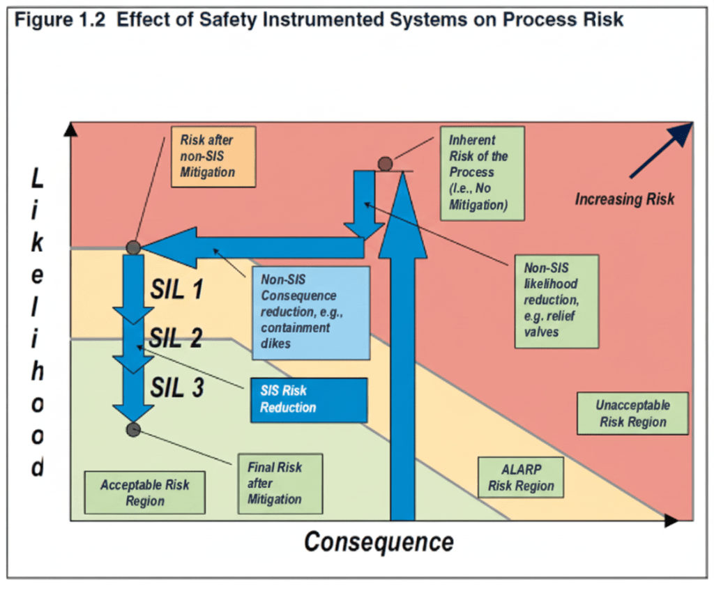 จะเห็นได้ว่าจังหวะนี้ ระบบการหยุดเครื่องจักรอัตโนมัติด้วยเครื่องมือวัด หรือ Safety Instrumented System (SIS) จะเข้ามาเพื่อช่วยให้ความเสี่ยงของเราต่ำลงจนไปอยู่ในเกณฑ์ที่ยอมรับได้