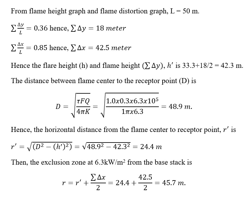 Design the flare exclusion zone 6.3 kW/m2 of the elevated flare stack height 33.3-meter, fraction of heat radiated 0.3, the maximum capacity at 34,056 m3/h and the heat radiation at flame is 6.3×105 kW through the flare inside diameter 0.468 meter against the design wind velocity is 8.9 m/s. The material is hydrocarbon vapour, the average relative molecular mass of vapour is 46.1 and the flow temperature is 422 K.