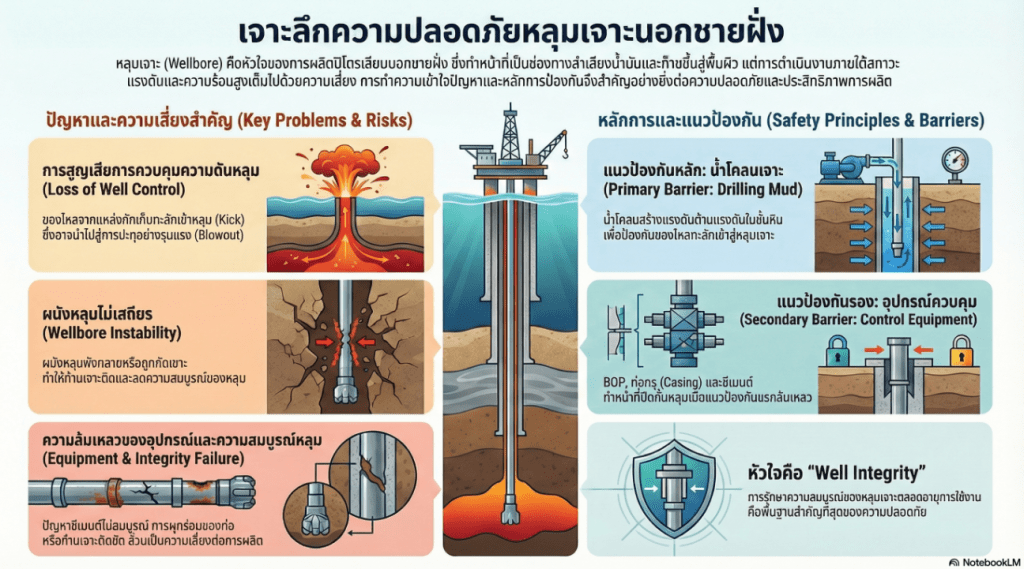 หลักการพื้นฐานที่สุดของความปลอดภัยของหลุมเจาะคือการมี ระบบกั้น (Barriers) อย่างน้อย 2 ชั้นที่ทำงานเป็นอิสระต่อกัน เพื่อป้องกันไม่ให้ของไหล (น้ำมัน/ก๊าซ) ไหลอย่างควบคุมไม่ได้จากแหล่งกักเก็บสู่พื้นผิว