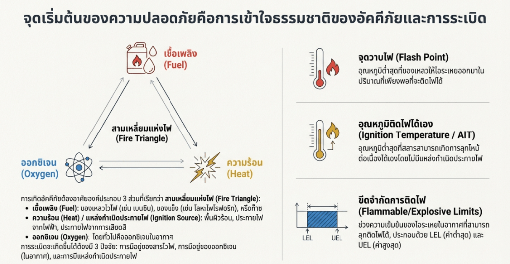 แก่นสำคัญของการเกิดไฟไหม้ Basic of Fire Triangle และคุณสมบัติของสารที่สำคัญ