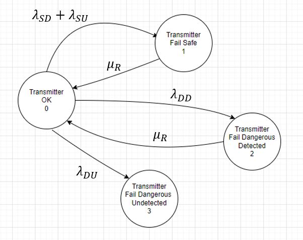 ตัวอย่าง#1 ของการเขียนสถานะ หรือ State ของ Transmitter หนึ่งตัว ว่าจะมีสถานะ 4 สถานะ ได้แก่ OK, Fail Safe, Fail Dangerous Detected, และ Fail Dangerous Undetected ตามรูปข้างล่าง