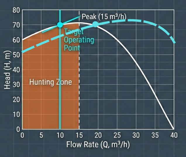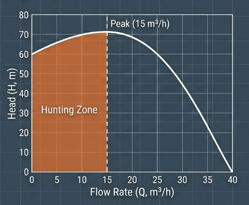 ในช่วง Hunting Zone หากลากเส้น System Curve (ความต้องการของระบบ) ตัดผ่านกราฟปั๊ม อาจจะเกิดจุดตัดได้ถึง 2 จุด (คือจุดที่ Flow ต่ำและ Flow สูงที่ให้ Head เท่ากัน)