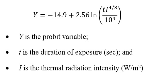 The probit functions are available for a variety of exposures, including exposures to toxic materials, heat, pressure, sound, and etc. Below is the probit function to estimate fatalities level for lethal toxicity.