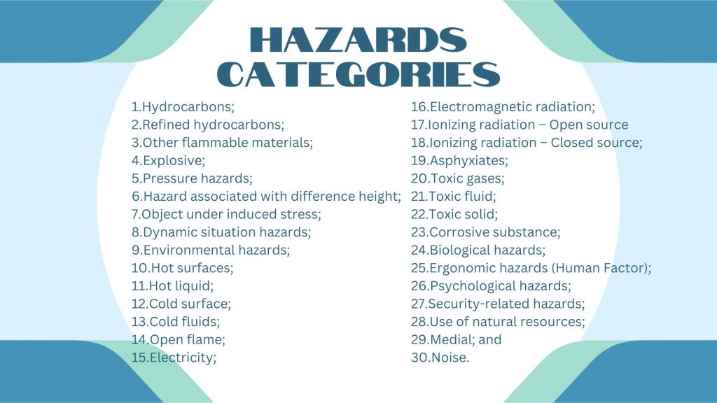 ISO 17776 is “Petroleum and Natural Gas Industries – Offshore Production Installations – Major Accident Hazard Management during the Design of New Installations” ใน Annex F, จะมี HAZID guidewords เช่น Hydrocarbon, Explosives, Pressure Hazards, Hazard associated with differences in height, Toxic gas, Toxic fluid, Toxic solid, และอื่นๆ