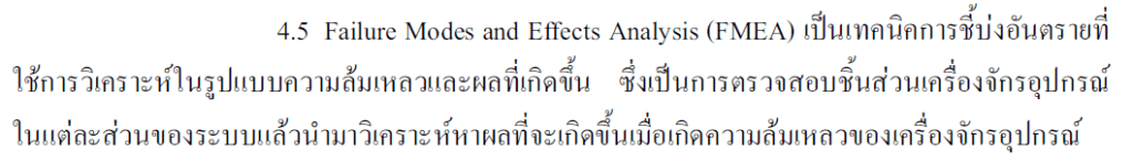 “4.3 Failure Modes and Effects Analysis (FMEA) เป็นเทคนิคการชี้บ่งอันตรายที่ใช้วิเคราะห์ในรูปแบบความล้มเหลวและผลที่เกิดขึ้น ซึ่งเป็นการตรวจสอบชิ้นส่วนของเครื่องจักรอุปกรณ์ในแต่ละชิ้นส่วนของระบบแล้วนำมาวิเคราะห์หาผลที่จะเกิดขึ้นเมื่อเกิดความล้มเหลวของเครื่องจักรอุปกรณ์”