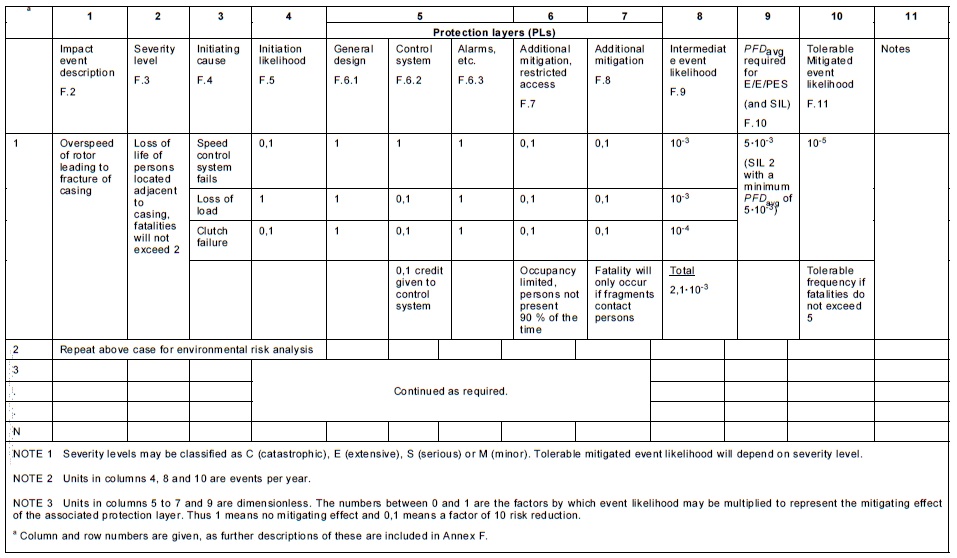 - แถวที่ 10 เกณฑ์ความเสี่ยงที่ยอมรับได้ Tolerable mitigated event likelihood ซึ่งจะพิจารณาจากค่าเกณฑ์ความถี่ต่ำสุดที่ยอมรับได้จากผลกระทบที่อาจจะเกิดกับตัวบุคคล สิ่งแวดล้อม และอื่นๆ มาเป็นเกณฑ์ขั้นต่ำในการออกแบบระบบรักษาความปลอดภัยด้วยเครื่องมือวัด