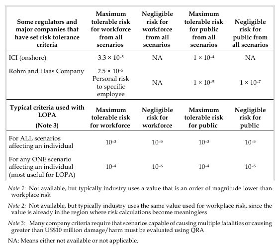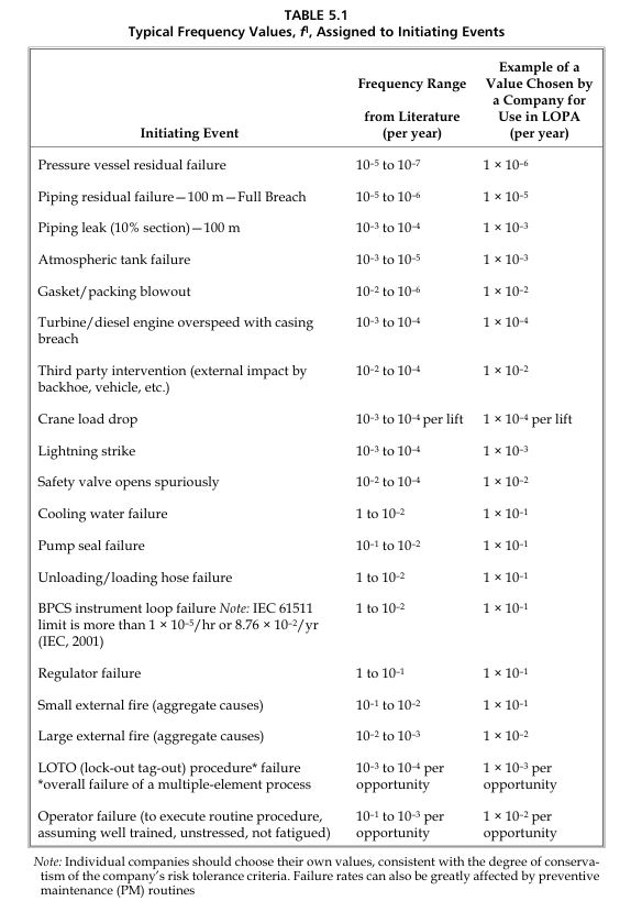 ตารางข้างล่างเป็นตัวอย่างค่าความถี่ของเหตุการณ์ต่างๆที่เราใช้ในการศึกษา LOPA study โดยเป็นบ่งบอกโอกาสการเกิด incident เช่น อุปกรณ์เสีย รั่วไหล แตกหักเสียหายเป็นต้น ในหน่วย ครั้ง/ครั้งที่ทำงาน (Low demand จะเป็นครั้งต่อปี)
