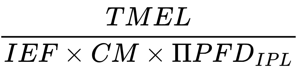 - หลังจากนั้นสุดท้าย คำนวนหาค่าความต่าง Gap Assessment ระหว่าง ค่าเกณฑ์ความถี่ของสถานการณ์ที่ยอมรับได้ Target Mitigated Event Likelihood กับความถี่ของเหตุการณ์ ตัวปรับค่า และการมีอยู่ของระบบป้องกันอันตรายต่างๆ Independent Protection Layer ต่างๆ ตามสูตรข้างล่างนี้
