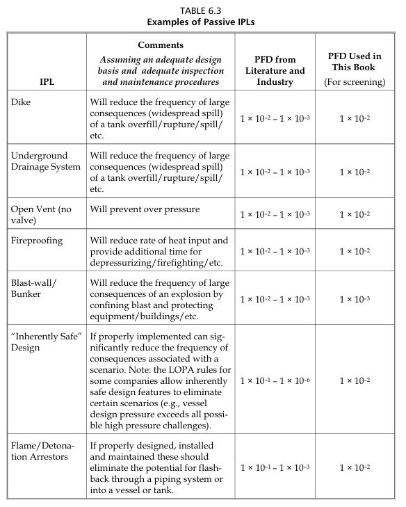 ตารางข้างล่างเป็นตัวอย่าง ค่าโอกาสที่อุปกรณ์ป้องกันต่างๆในระบบจะไม่สามารถใช้งานได้เมื่อต้องการ Probability of Failure on Demand (PFD) ที่มีค่าในหน่วย ครั้งต่อปี โดยมีทั้งแบบอุปกรณ์ที่ทำงานในเชิงรุก Active IPLs หรือเรียกว่าแบบ “ป้องกันก่อนเกิดเหตุ” และแบบเชิงตั้งรับ Passive IPLs หรือเรียกว่าแบบ “ควบคุมความรุนแรง”