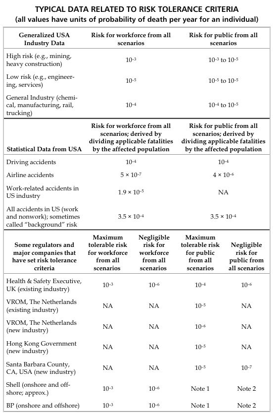 ตังอย่างค่าเกณฑ์ความถี่ของสถานการณ์ที่ยอมรับได้ Target Mitigated Event Likelihood (TMEL) ในงานประเภทต่างๆใน USA และในประเทศต่างๆ ทั้งแบบโรงงานเดิมและแบบโรงงานที่กำลังสร้างใหม่