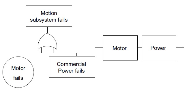 ความสัมพันธ์ทั้งสองแบบ ไม่ว่าจะเป็นแบบอนุกรมหรือแบบขนาดของ RBD นั้นสามารถเปรียบเทียบการชี้บ่งอันตรายแบบอื่น เช่น การวิเคราะห์ความเสียหายของระบบแบบต้นไม้ Fault Tree Analysis หรือ FTA ตามรูปข้างล่าง เช่น