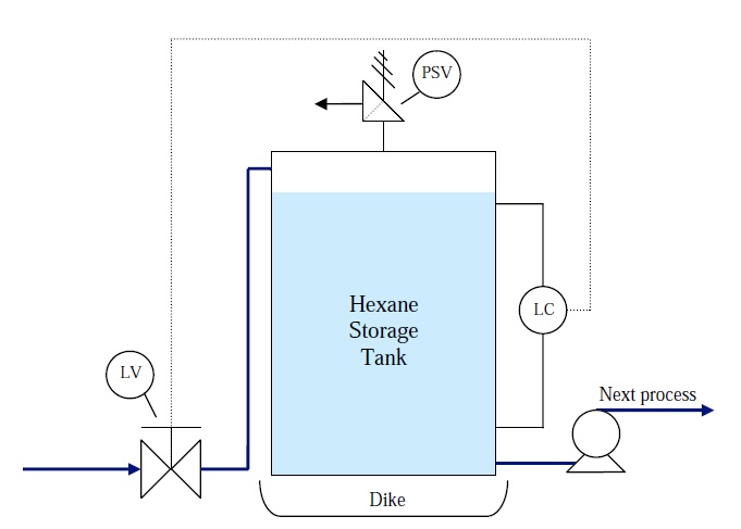 จากรูปเป็นตัวอย่าง ถังที่เก็บสาร Hexane ซึ่งเป็นสารไฮโดรคาร์บอนประเภทหนึ่งที่ติดไฟได้ โดยในขณะนี้มีแต่ระบบควบคุมปกติทั่วไป Basic Process Control System หรือ BPCS โดยในการควบคุมระดับของสาร ได้ใช้วาล์วควบคุมที่ต่อเชื่อมระบบกับระดับของเหลวที่อยู่ภายใน ซึ่งมีวาล์วระบายความดัน Pressure Safety Valve หรือ PSV ที่มีการติดตั้งไว้เพื่อป้องกันการเกิดความดันที่มากเกินไป