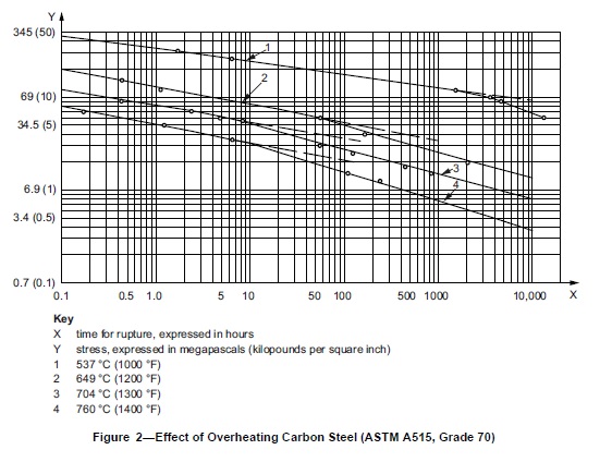 ในแง่เครื่องจักรที่อาจจะสัมผัสความร้อน มาตราฐาน API Standard 521; Pressure-relieving and Depressurizing Systems ก็ได้แสดงผลของความร้อนที่กระทำกับเหล็กกล้าคาร์บอนปกติไว้ดังรูปข้างล่าง จากรูปจะเห็นได้ว่าค่าความแข็งแรงของเหล็กกล้าคาร์บอนจะลดลงเมื่อเวลาในการสัมผัสกับความร้อนนานยิ่งขึ้น